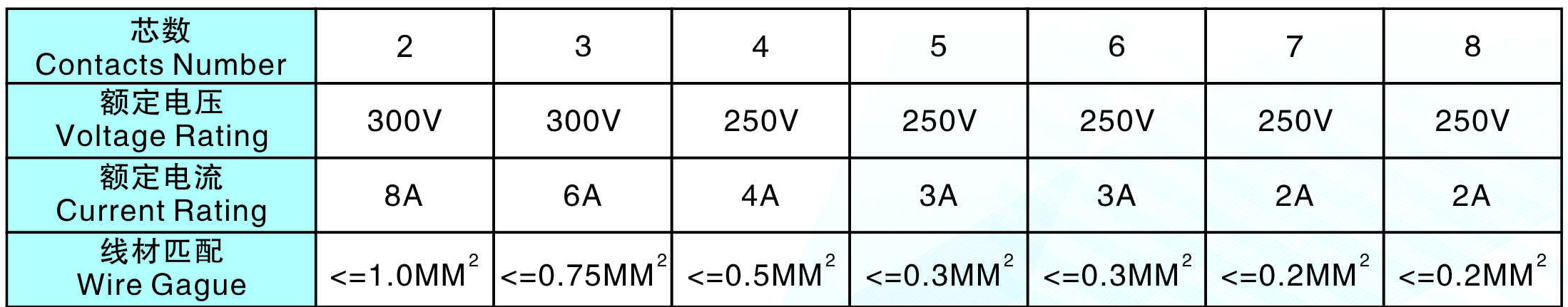 線材匹配(Wire  Gague):<=1.0MM2       <=0.75MM2       <=0.5MM2      <=0.3MM2        <=0.3MM2        <=0.2MM2        <=0.2MM2