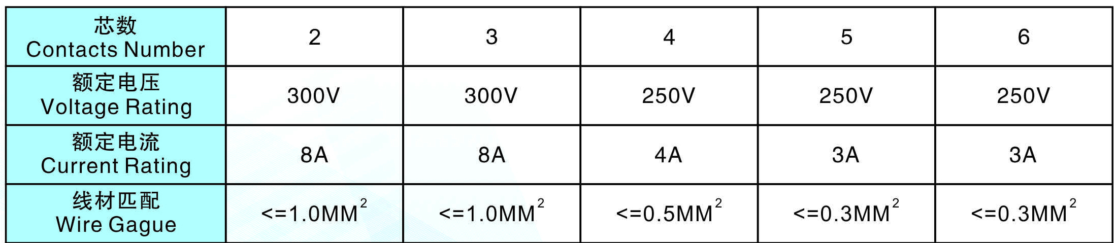 線材匹配(Wire Gague): <=1.0MM2 <=1.0MM2 <=0.5MM2 <=0.3MM2 <=0.3MM2